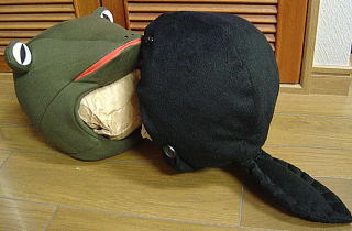 カエルとペアでかぶるとまぁ、お玉じゃくしに見えないことはない。