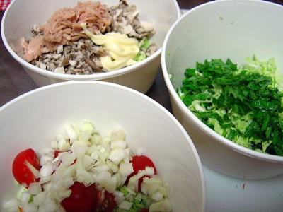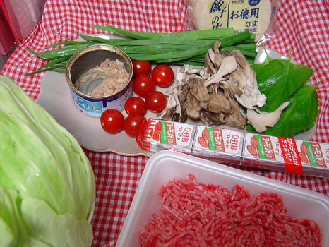 にらにキャベツにトマトにマイタケ。チーズもいっとこう、あ、シーチキンも。