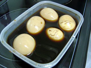 はー♪この煮卵は冷蔵庫で寝かしてから。