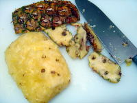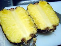 丸ごとパインを会社の方からいただき歓喜! こんなの初めて。ドッキドキで包丁を・・・。こんな切り方でいいのかしら?? 生のパインはこんなに甘いんですねー。もっと酸っぱいもんかと思ってた。 |
