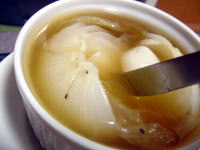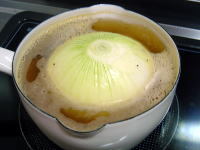 玉ねぎ、立派な玉ねぎ。 少し憧れていたの・・・・1個まるごとコトコトとスープで煮込むというもの。 小さなミルクパンにいっぱいのこんな大きな玉ねぎ。さてさて柔らかくなるのか?? 実際は最後の肯定に電子レンジでチーンを入れてようやく柔らかくなりました。 コンソメひとつでこんなに甘い美味しいスープ。これは玉ねぎの持つ素敵な甘さです。 |