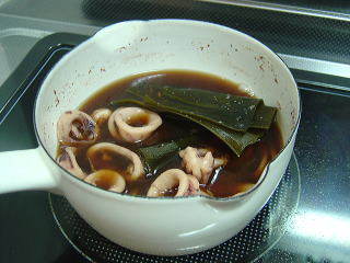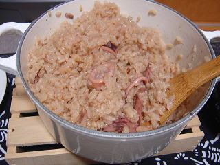 まずはお出汁でよくイカにお味を染み込ませてからお米に投入!さ、上手く炊けてよね!と願いを込めます。