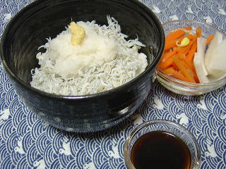 暑くて夏バテしそうなそんな日によく登場の「しらす丼」 釜揚げしらすをふんだんに・・・大根おろしを乗っけて、お出汁のきいたポン酢をサッとかけて召し上がれ。 食欲無くっても不思議とたくさん食べれちゃうあっさりしたどんぶりです。 |