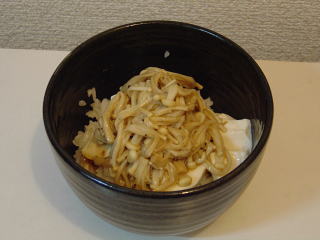 なにこれ?色悪いねー。 これはね、エノキです。バター醤油で炒めまして その下にはお豆腐が! その上からアツアツのバター醤油をかけますと 何とも言えず、美味しい。洋風な感じ?? 案外、お豆腐に合いますよ。 |