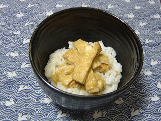 質素!質素!質素! おあげさんしかなかったから・・。なのでお出汁で甘辛くコトコトと煮ました。すると味が染みて美味しい! コンコンきつねも喜ぶ「おあげ丼」。おあげってこんなに美味しかったっけってなるよ。 |