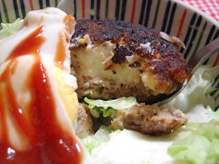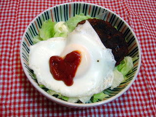 ハンバーグ定食をご飯に全部、乗っけたら「ロコモコ丼」なのよね!? これはなんちゃってかな!?こんなのでしたっけ!?ま、美味しけりゃいいのです♪ このハンバーグにはチーズがギュッと入ってます!豚ミンチONLYのトンバーグですよ! ケチャップでハート書いちゃったりして〜♪♪愛もギュッと詰まってます。 |