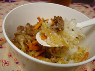 たまにはお肉も食べなければ・・・と豚肉の生姜焼きをカリカリッとさらに炒めて「生姜焼き丼」です。 お肉だけじゃダメですよ!その2倍くらい野菜も食べなきゃ。なのでキャベツと人参を炒めたのも ご飯に乗せちゃいましょう。甘辛いお味と生姜がきいてスタミナ満点です。 |