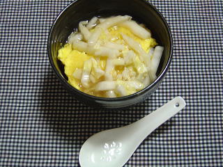 これも天津丼。 王将の前を通った帰り道、無性に食べたくって 急いで帰って、冷蔵庫を見渡し、かすかに残った 白菜の端切れも入れて、和風のあんをかけて アツアツをいただきました。 |